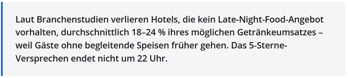 Es ist kurz nach zehn Uhr abends. Vier Entscheider aus dem Gastro-Einkauf sitzen an der Bar eines Stadthotels der Luxuskategorie – müde von einem langen Messetag, durstig, und mit dem guten Gefühl, dass heute noch Geschäfte zu machen sind. Der Barkeeper ist aufmerksam, die Drinks kommen schnell. Dann die Frage: „Können wir noch etwas essen? Warm, am besten."