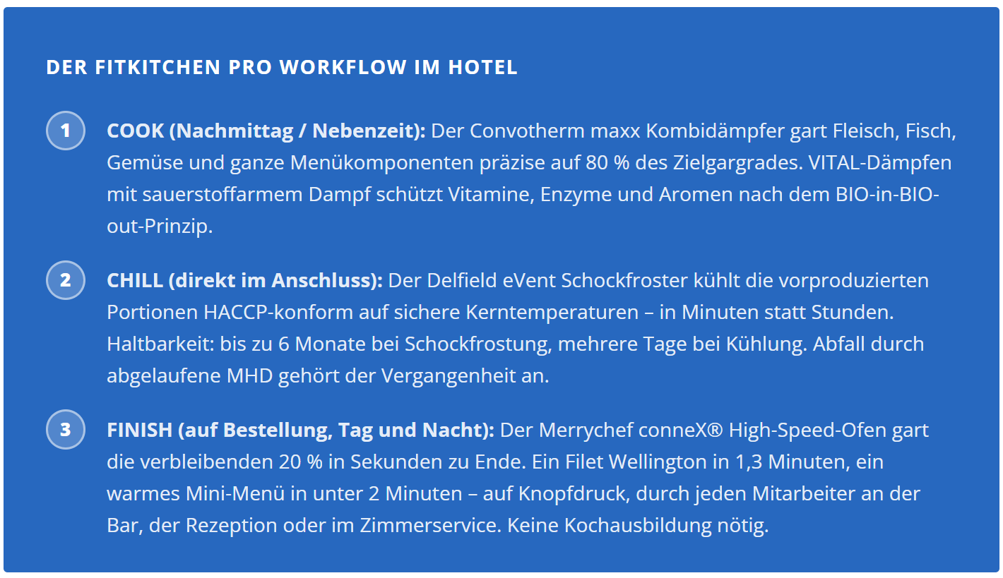 FITKITCHEN ist nicht das Ende eines kulinarischen Anspruchs, sondern sein konsequentes Ende: ein durchdachtes System aus Convotherm, Delfield und Merrychef, das die Produktion von der Ausgabe trennt, Fachpersonal von Routineaufgaben befreit und aus jedem Servicepunkt im Hotel einen möglichen Umsatzpunkt macht – rund um die Uhr, sieben Tage die Woche.