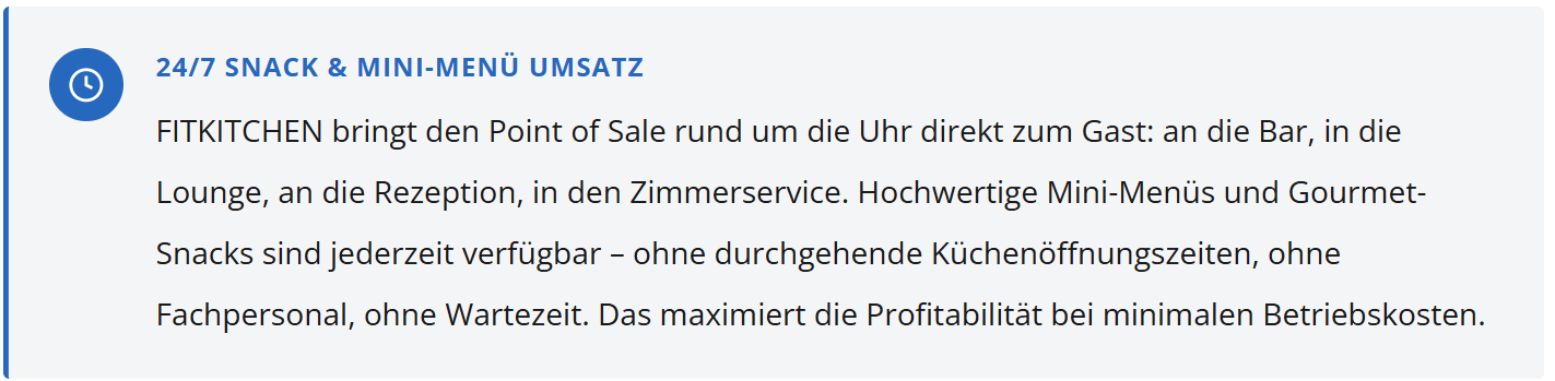 Messeabend, 22 Uhr. Die Gäste an der Hotelbar haben Hunger. Der Barkeeper schiebt die Salzstangen rüber – und erklärt, was kein 5-Sterne-Haus sagen sollte. FITKITCHEN löst genau dieses Problem: All-Day-Dining ohne durchgehenden Küchenbetrieb, ohne Fachpersonal, in weniger als 2 Minuten.