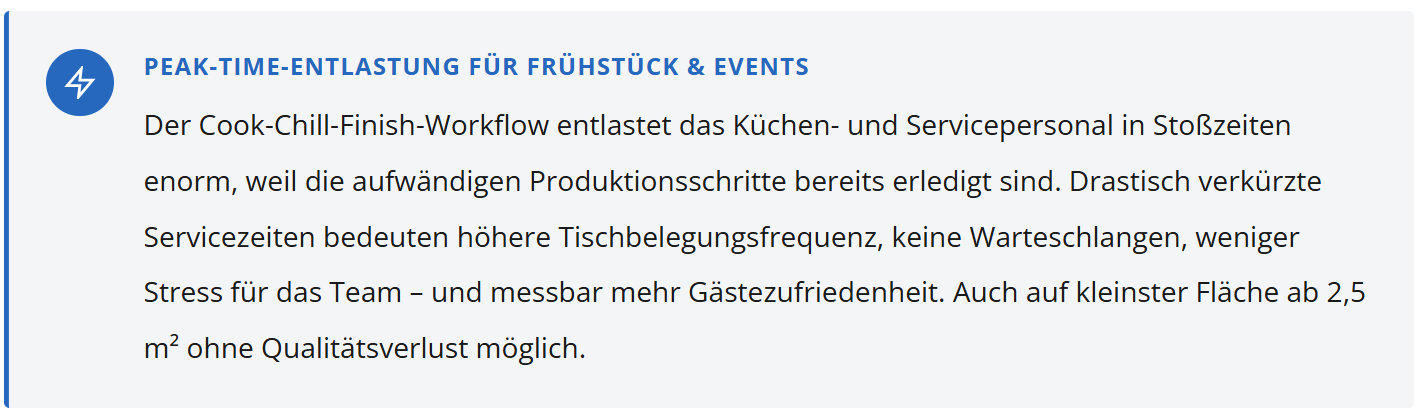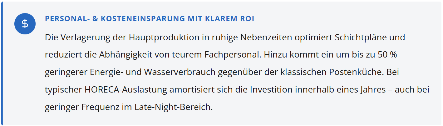 Bei nur 15 zusätzlichen Portionen pro Abend und einem Durchschnittswert von 5,00 € Deckungsbeitrag entstehen pro Monat rund 2.250 € zusätzlicher Rohertrag – aus einer Investition, die keinen zusätzlichen Koch und keine verlängerten Öffnungszeiten der Hauptküche erfordert.