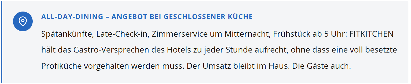 Spätankünfte, Geschäftsreisende mit engem Zeitplan, Gäste nach langen Messe- oder Konferenztagen: Wer um 23:30 Uhr eincheckt, will nicht Salzstangen. Mit FITKITCHEN ermöglichen Hotels echten 24/7-Zimmerservice ohne zusätzliches Küchenpersonal – ein Differenzierungsmerkmal, das in Bewertungen und Buchungsraten sichtbar wird.